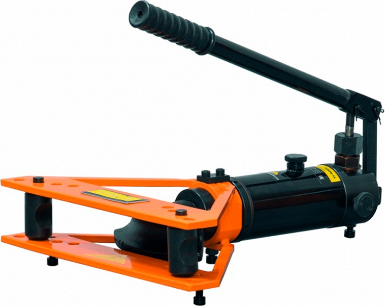 - Тип: ручной гидравлический (продавливает заготовки при помощи гидравлической направляющей) – отличен от других вариантов ручных трубогибов тем, что его привод усилен гидравликой, что позволяет монтажнику прикладывать меньше усилий и тратить гораздо меньше времени при гибки стальных труб
